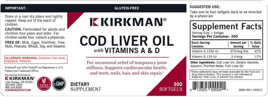 Kirkman Cod Liver Oil Softgels with Vitamin A & D for Foundational Health - 300 ct - Hypoallergenic - Rich in Essential Fatty Acids