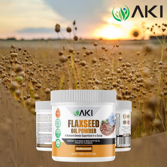 AKI Organic Flaxseed Oil Powder - Rich in Omega-3 Fatty Acids, Fiber, & Lignans - No Artificial Additives - High-Quality Ingredients - 5.30oz/150g