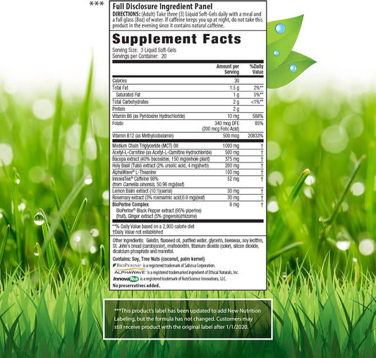 12-in-1 Nootropic Brain Supplement with Caffeine Anhydrous and Ginkgo Biloba for Memory and Focus - Alpha GPC, L Theanine, Choline, B12, Bioperine - 1321mg (60ct)