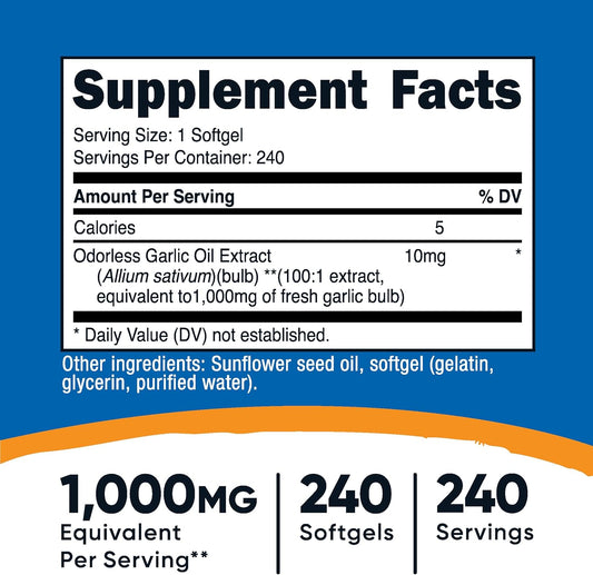 Garlic 1000mg Softgels - Odorless Gluten Free Supplement (240 Count) by Nutricost