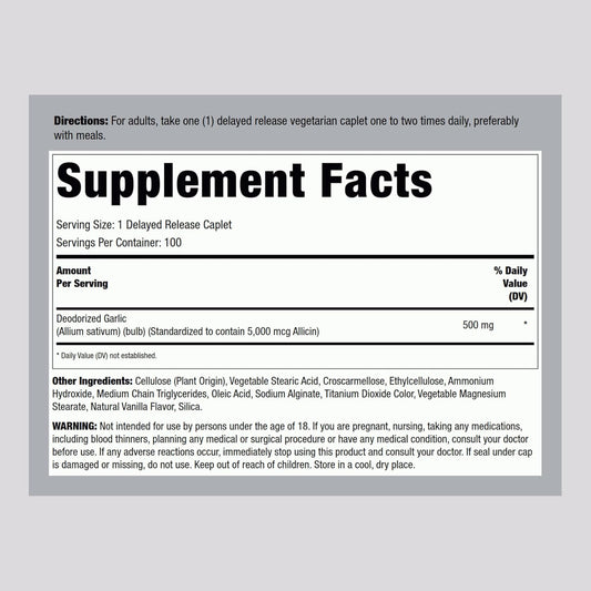 High Potency 5000mg Garlic Supplement | 100 Caplets | Odorless & Non-GMO | Gluten Free Garlic Extract Tablets