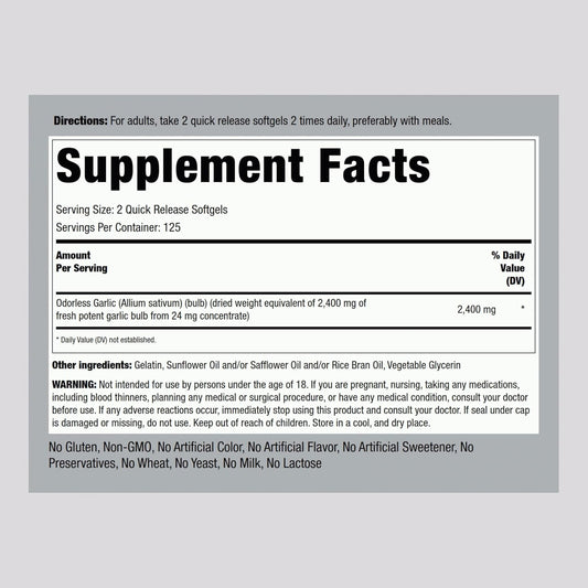 High Potency Piping Rock Odorless Garlic Softgels - 2400mg, 250 Pills - Herbal Supplement, Non-GMO, Gluten Free Extract