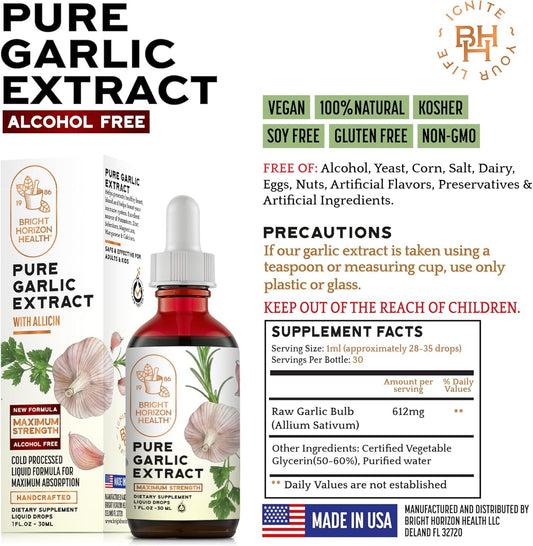 Bright Horizon Health Pure Garlic Extract with Allicin - 11X Stronger Immune Support - Vegan Friendly Liquid Formula - 1 fl.oz Bottle