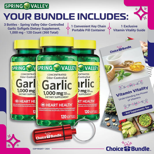 Garlic Softgels Bundle: Odor-Controlled Dietary Supplement 1,000mg 120 CT 3 pk + Vitamin Guide & Pill Container - 5 Items