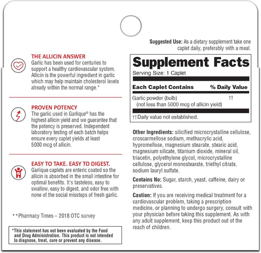 2 Packs of Garlique Healthy Cholesterol Formula with 5000 mcg Allicin, 60 Enteric Coated Caplets - Total 120 Caplets