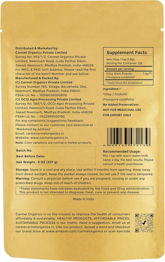Organic Giloy Stem Powder - 8 Ounce Pack for Immunity Support | Tinospora Cordifolia Herbal Supplement | Non-GMO, Preservative-Free