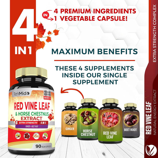 Red Vine Leaf Extract Capsules with Horse Chestnut, Beet Root & Ginger - Herbal Supplement for Heart, Leg Vein & Energy - 90 Vegan Capsules
