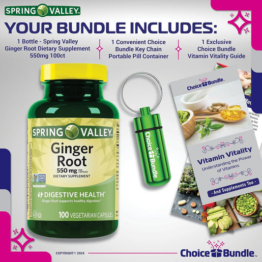 Spring Valley Ginger Root Digestive Health Supplement 550mg Capsules - 100 Ct Bundle with "Vitamin Vitality" Guide and Pill Container - 3 Items