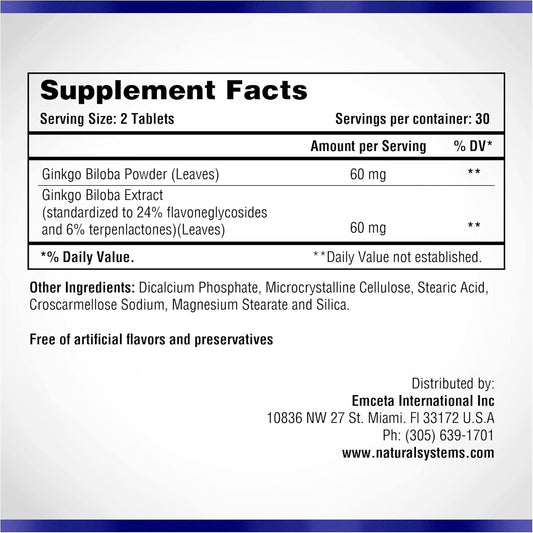 Naturasys Ginkgo Biloba 60mg Tablets - Brain Memory Supplement for Energy - Concentration Support - Men & Women Memory Vitamins