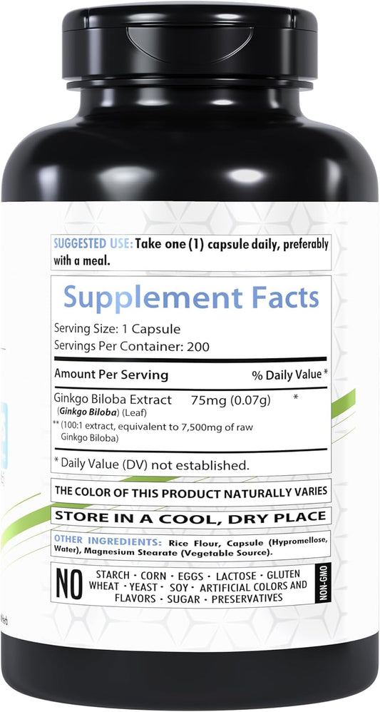 Premium Ginkgo Biloba Extract Capsules - 7500mg Strength - 200 Count - Non-GMO & Vegetarian - USA Made