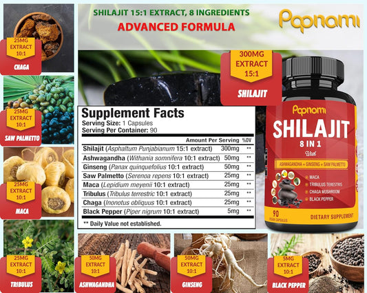 3 Month Supply Papnami Shilajit Himalayan Capsules with Ashwagandha, Ginseng, Saw Palmetto, Maca, Tribulus, Chaga, and Black Pepper