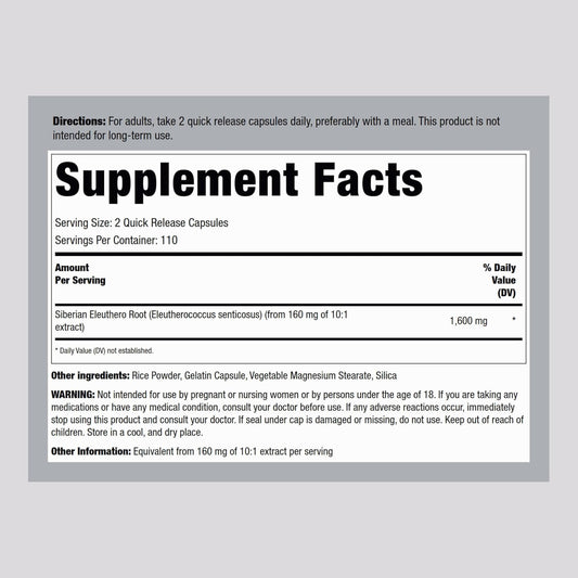 Siberian Eleuthero Root Capsules 1600mg | 220 Count | Herbal Extract Supplement | Non-GMO, Gluten Free