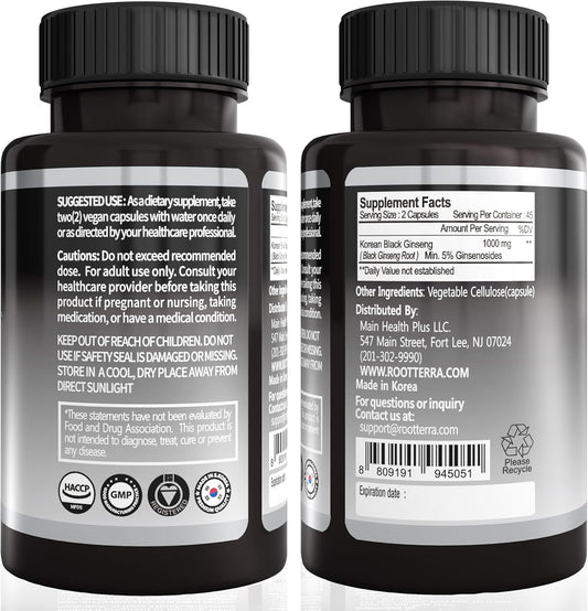 90 Vegan Capsules of 1000mg GeumHeuk Korean Black Panax Ginseng - Non GMO with High Ginsenosides for Immunity, Mental Performance, Stamina, and Energy Boost for Men and Women