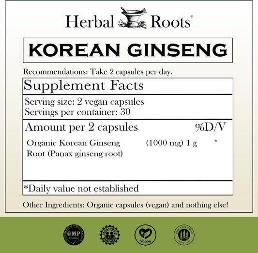 Organic Korean Ginseng Root Powder Capsules - 1000mg with High Ginsenosides for Energy & Performance