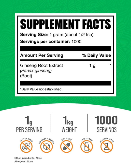BulkSupplements.com Ginseng Root Extract Powder - 1000mg per Serving, Panax Ginseng Supplement, Herbal Vegan & Gluten Free - 1kg (2.2 lbs) Pack of 1