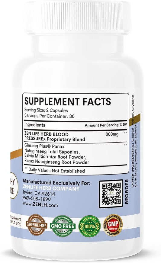 Pure Plant-Based Blood Pressure Support Supplement - ZEN LIFE HERB Blood Pressure & Heart Health Formula with Ginseng Blend (60 Capsules)