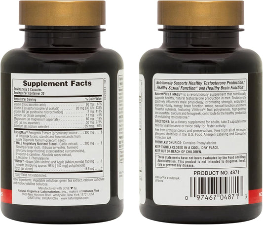 Natures Plus T-Male Supplement - 120 Vegetarian Capsules with Ginseng, Rhodiola & FuranoMax - Gluten Free - 60 Servings