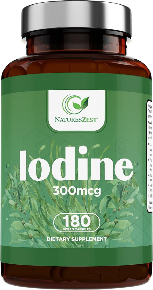 180-Day Supply of Natures Zest Iodine Supplement Capsules - 300mcg Pure Iodine for Thyroid Support - Vegan Formula with Potassium Iodide - Promotes Normal Thyroid Function