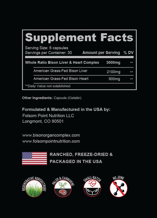 100% Grass-Fed Bison Liver & Heart Complex Supplement | Desiccated Pill | Made in USA | Single Bottle of Folsom Point Nutrition Dynamic Duo