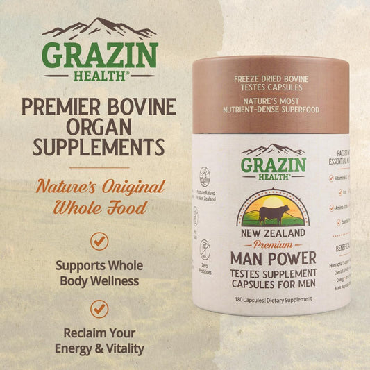 30 Day Supply of GRAZIN HEALTH Grass Fed Bovine Testes Man Power Capsules