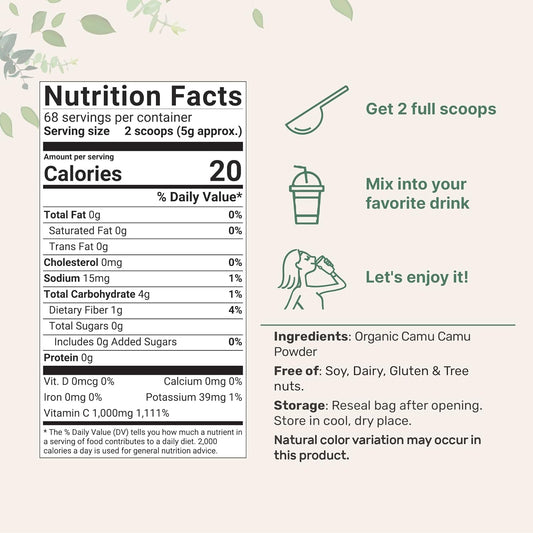 12 oz Micro Ingredients Organic Camu Camu Powder - High Vitamin C Level, Fresh Freeze-Dried Berries, GMO-Free, Vegan