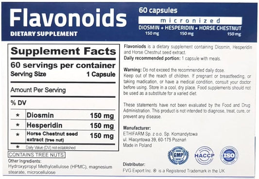 60-Day PureLife Nutrition Flavonoids Support Healthy Circulation, Veins, Capillaries, Lymphatic Drainage - Micronized Diosmin, Hesperidin, Horse Chestnut - Vegan - GMP Certified