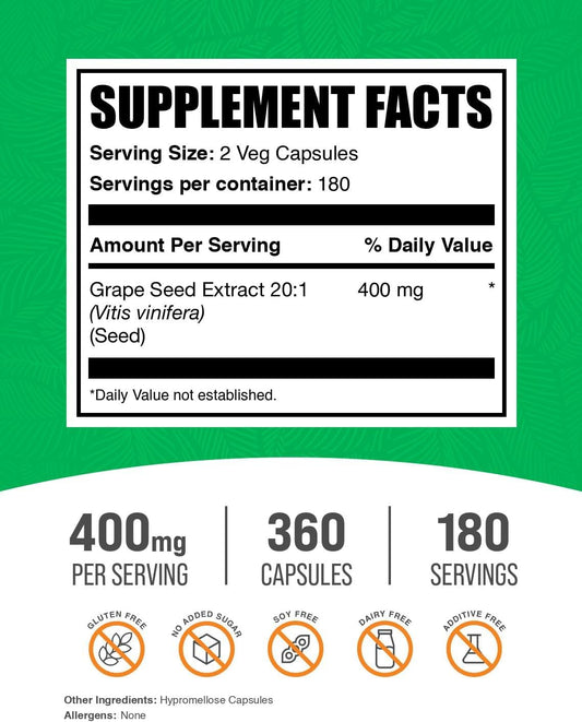 BulkSupplements.com Grape Seed Extract Capsules - 400mg Antioxidant Supplement, Vegan & Gluten Free - 360 Veg Capsules