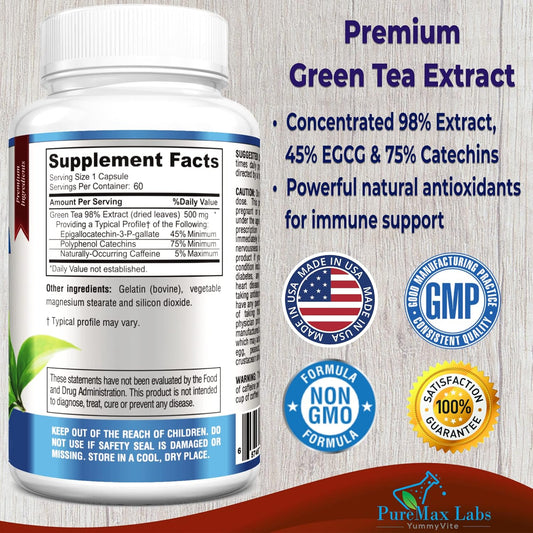 High Strength Green Tea Extract Capsules - 98% Polyphenol Catechins, 45% EGCG, Antioxidant - 60 Count