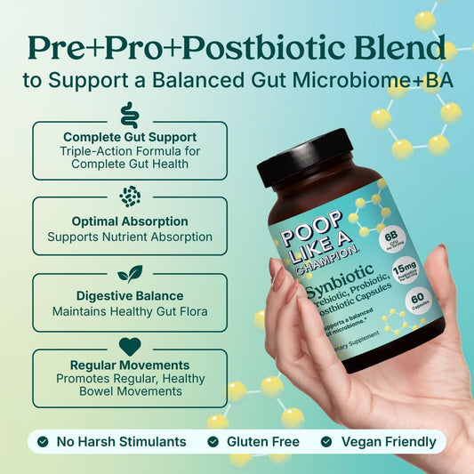 60 Vegan Capsules of Poop Like a Champion Gut Power Synbiotic with Prebiotic, Probiotic, and Postbiotic - Non-GMO Digestive Health Supplement with 6.5 Billion CFU