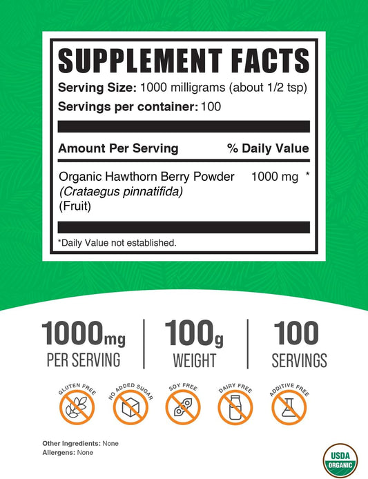BulkSupplements.com Hawthorn Berry Powder - Organic Supplement, Vegan & Gluten Free, 1g per Serving, 100g (3.5 oz) Pack