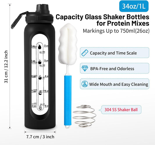 34oz RhythmFit Glass Shaker Bottle with 304SS Ball, BPA-Free Blender for Protein Mixes, Includes Retractable Cleaning Brush - Black