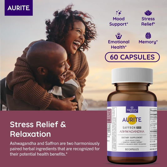 60 Count Aurite Saffron Ashwagandha Supplement for Stress Management & Mood Support - Memory Boost for Women & Men - Vegetarian, Non-GMO, Gluten-Free, Soy-Free (2 Month Supply)