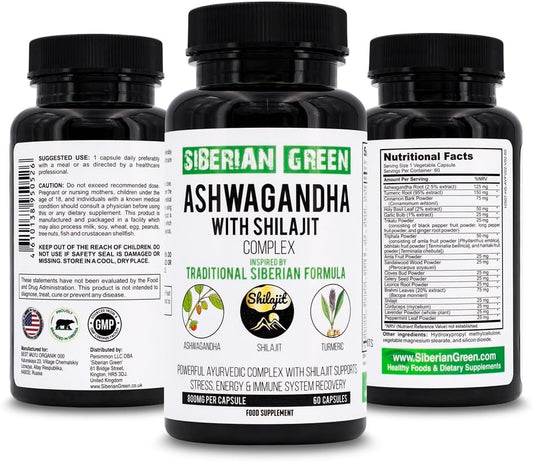 60 Capsules of Siberian Green Ashwagandha, Altai Shilajit, and Turmeric Ayurvedic Complex for Stress Relief, Energy, Mood, and Immune System Support