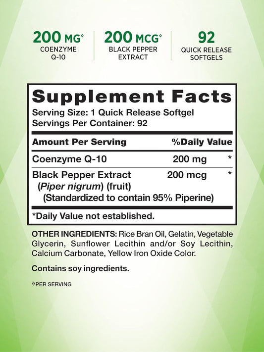 200 mg CoQ10 Softgels with Black Pepper Extract - 92 Count, Non-GMO & Gluten Free for Enhanced Absorption