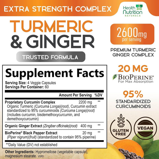 2600mg Turmeric Curcumin with BioPerine & Ginger Capsules - Natural Heart & Joint Support Supplement - 95% Curcuminoids for Max Absorption