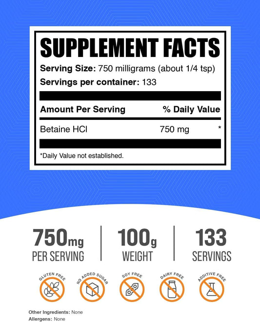 Betaine HCl Powder - 750mg per Serving, Gluten Free Betaine Hydrochloride Supplement - 100g (3.5 oz)