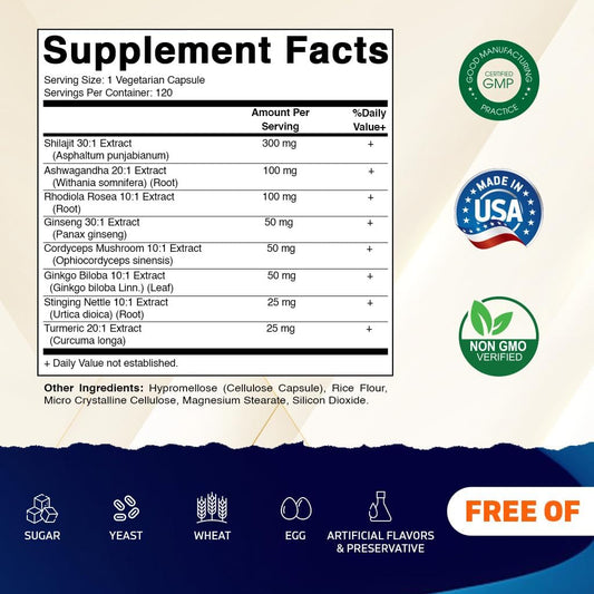 Extra Strength Shilajit Complex Capsules with Ashwagandha, Rhodiola, Ginseng, Cordyceps, Ginkgo, Nettle, Turmeric - 120 Veggie Capsules for Men & Women
