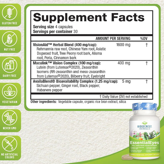 Ridgecrest Herbals EssentialEyes: Natural Eye Vitamin Supplements with Lutein, Zeaxanthin, Bilberry Extract for Eye and Vision Health - 120 Vegan CapsulesVendor:RidgeCrest HerbalsRegular price $181.63 AUDRegular priceUnit price / per-
