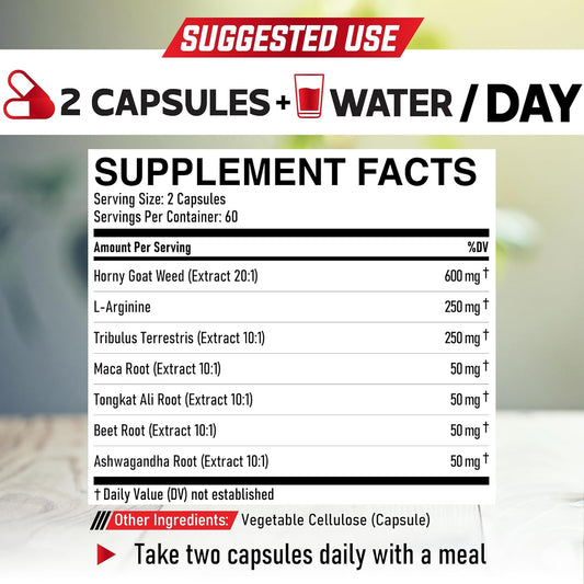 7-in-1 Ultra Test Support Supplement with Tribulus Terrestris, Horny Goat Weed, L-Arginine, Maca Root, Tongkat Ali, Beet Root - Energy and Muscle Strength Booster - 120 Capsules