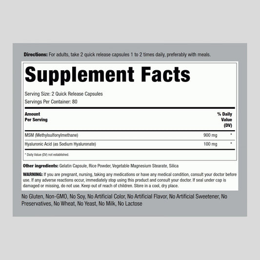 Hyaluronic Acid with MSM 1000mg Capsules - Non-GMO and Gluten Free Supplement by Piping Rock