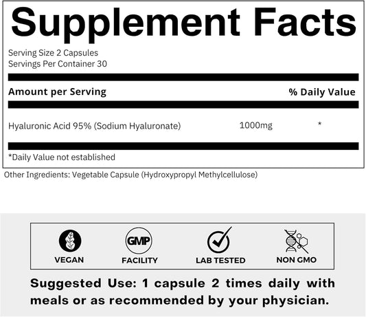 Highly Purified Hyaluronic Acid Capsules 500mg - 95% Sodium Hyaluronate - Low Molecular Weight - Non-GMO Fermented - 60 Capsules