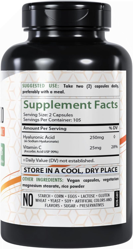 Hydrating Hyaluronic Acid Supplement 250mg - 210 Capsules with Vitamin C - Non-GMO & Gluten-Free