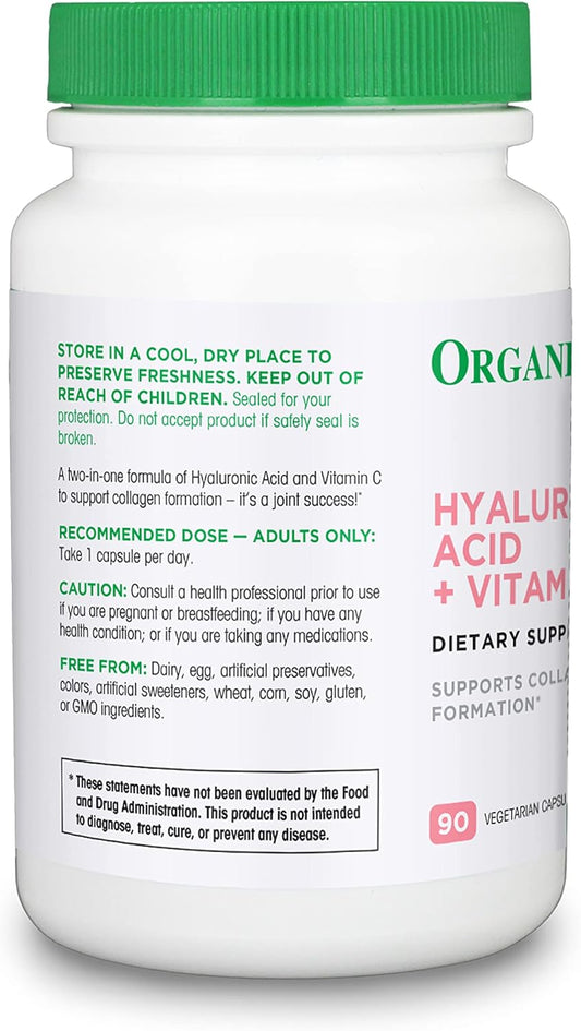 Organika Hyaluronic Acid and Vitamin C Capsules - Supports Collagen Formation, Joint Health, and Skin Hydration - 90 Capsules