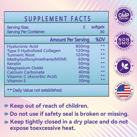 High Strength Johiear Hyaluronic Acid Supplements for Skin, Joints, Eyes, Hair, and Nails - 850mg Capsules, 60 Softgels (2 Pack)
