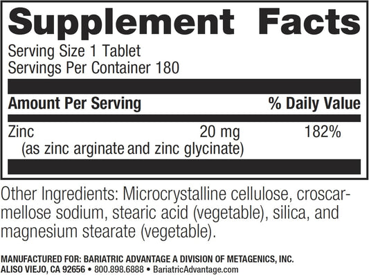 180 Non Chewable Zinc Chelate Tablets for Bariatric Surgery Patients, Highly Absorbable 20 mg Zinc Arginine and Glycine Formula
