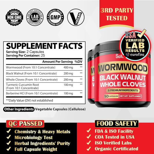 2 Packs of Satoomi Wormwood Capsules - 50 Capsules with Black Walnut, Cloves, Turmeric, and Berberine HCl - Immune System and Digestion Support Supplement