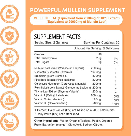 2 Pack Mullein Leaf Extract Chewable Gummies for Lung & Respiratory Support with Quercetin, Bromelain, and D3