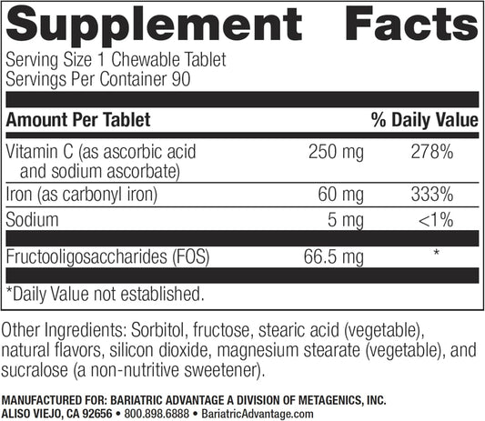 90 Count Bariatric Advantage Chewable Iron with Vitamin C for Enhanced Absorption - Lemon Lime, Easily Digestible for Gastric Surgery