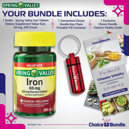 Spring Valley Iron Tablets Dietary Supplement 65 mg Value Size Bundle with Vitamin Vitality Guide & Pill Container - 200 CT (3 Items)