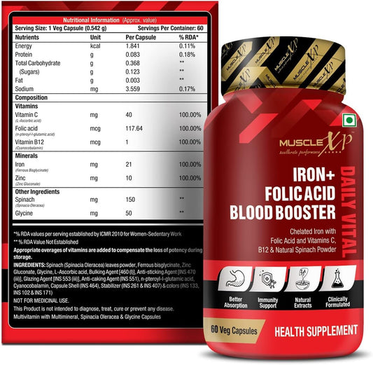 Chelated Iron Folic Acid Supplement with Vitamin C & B12, Natural Spinach Powder - 60 Veg Capsules